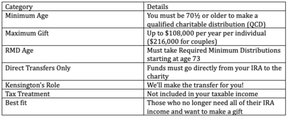 A QCD allows individuals aged 70½ or older to donate up to $108,000 per year directly from their traditional IRA to a qualified charity. This excludes the distribution from taxable income. This enables you to support a cause important to you while potentially reducing your tax liability.